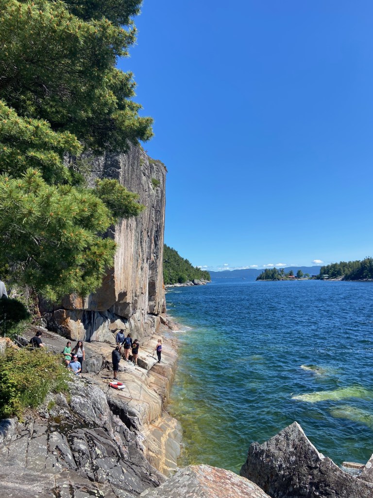 The trail to the pictographs is short, steep, scenic, and totally worth it. The trail is filled with different signs that explain the history of the area, and the formation of the rock faces and different formations that you’ll see along the trail. The famous “pictographs” are Indigenous paintings on the side of the rock face done with red ochre that often depict different animals, each with their own meanings. These pictures are hundreds of years old, and have remained accessible only by water or a daring walk on the rocks with a rope to hold onto. The round trip hike to the water and back to the parking lot is only around half an hour, so it’s quick and easy if you’re steady on your feet. Once you’re back at the parking lot, you can head onto the next part, or follow the road you came in on another two minutes down to Sinclair Cove and enjoy a chilly yet refreshing dip in the lake.
